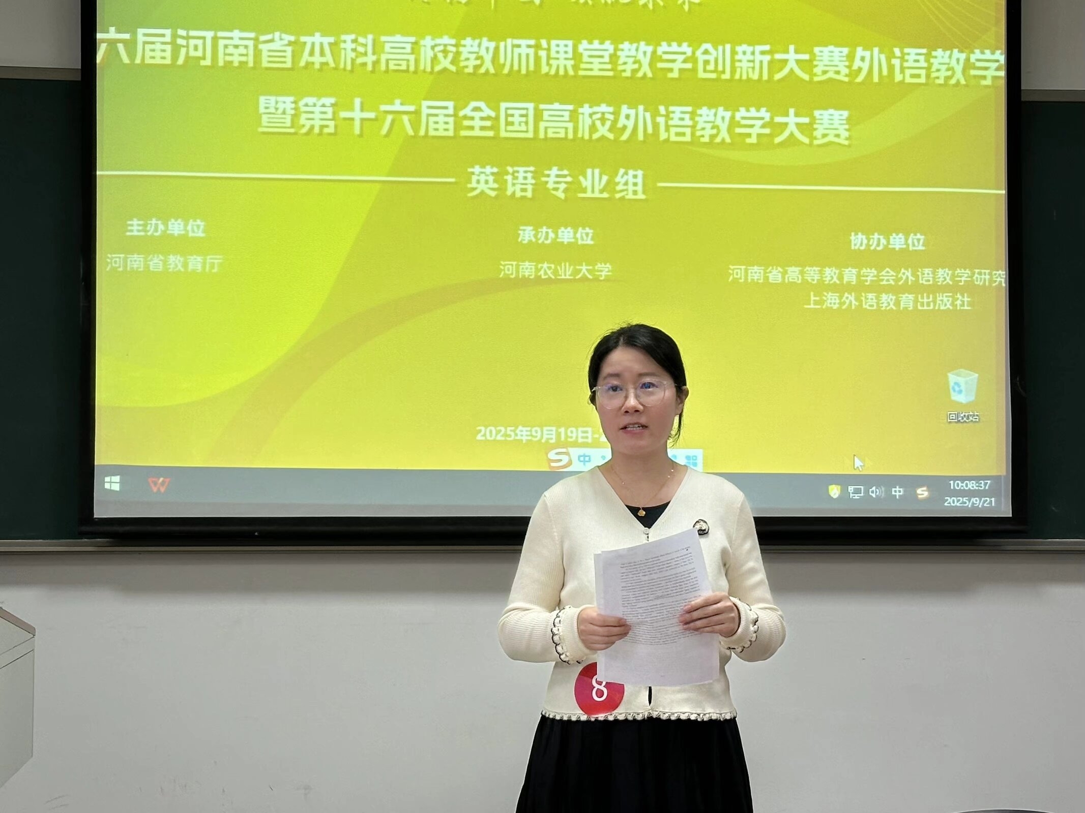 9月20日至21日,第六届河南省本科高校教师课堂教学创新大赛外语教学组暨第十六届全国高校外语教学大赛河南省赛英语专业组比赛在河南农业大学成功举办。本次大赛由河南省教育厅主办,河南省高等教育学会外语教学研究分会协办。我校外语学院教师耿文斐凭借出色表现,荣获英语专业组特等奖。