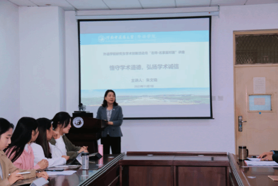 (图/文 闫舒瑶)为了营造良好的研学氛围,提升研究生的科研能力,2023年11月7日,外语学院“名师·名家面对面”讲座暨学术诚信专题知识双语测试在教学楼A638成功举办。讲座由外语学院副院长朱文晓主讲。辅导员于嘉明老师主持讲座,外语学院22级、23级全体研究生参加。